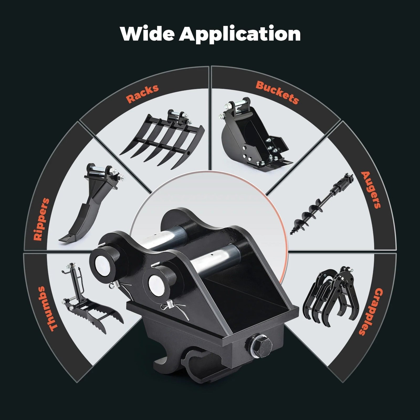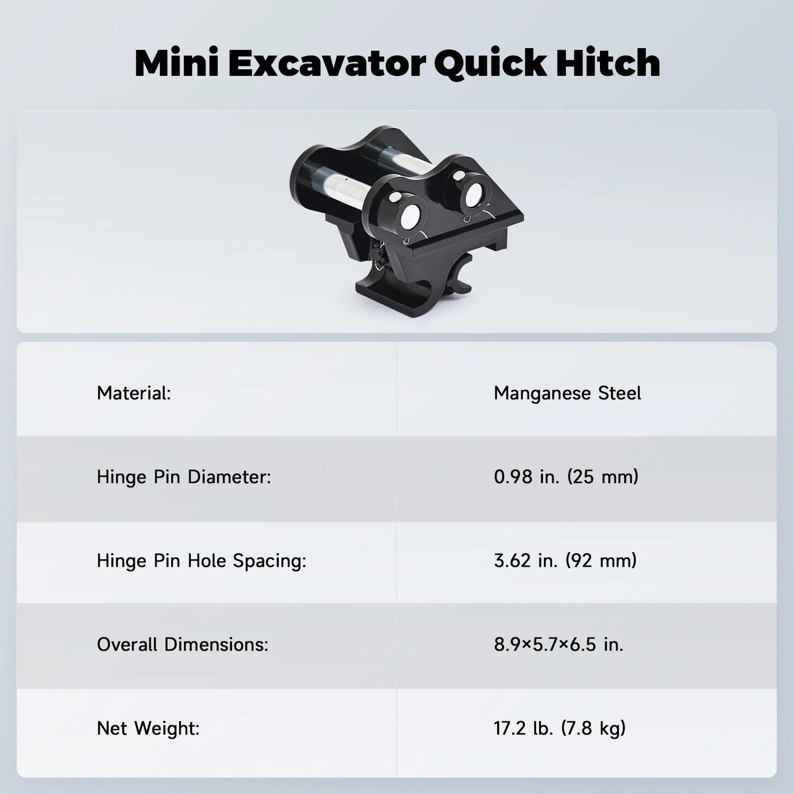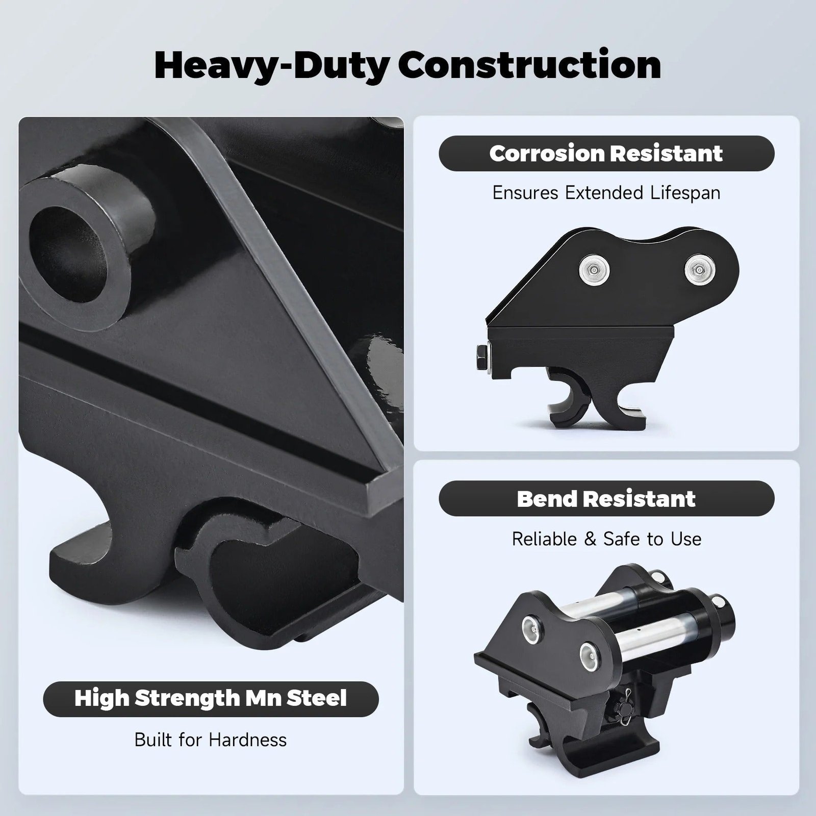 - Built for Tough Jobs:Â Made from high-hardness manganese steel, this quick change connection is engineered for durability, making it reliable to connect with most heavy mini excavator attachments