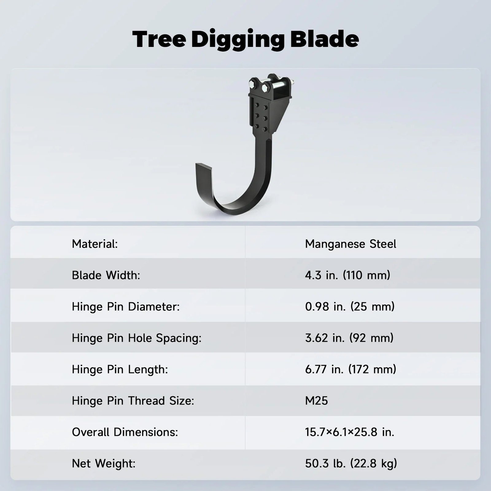 - Ideal for Mini Excavators:Â This tree digging blade features a 3.62 in. (92 mm) span, a 0.98 in. (25 mm) arm pin housing distance, and a 3.35 in. (85 mm) center wheelbase. It is designed to fit AHM mini excavators and various others up to 2 tons
